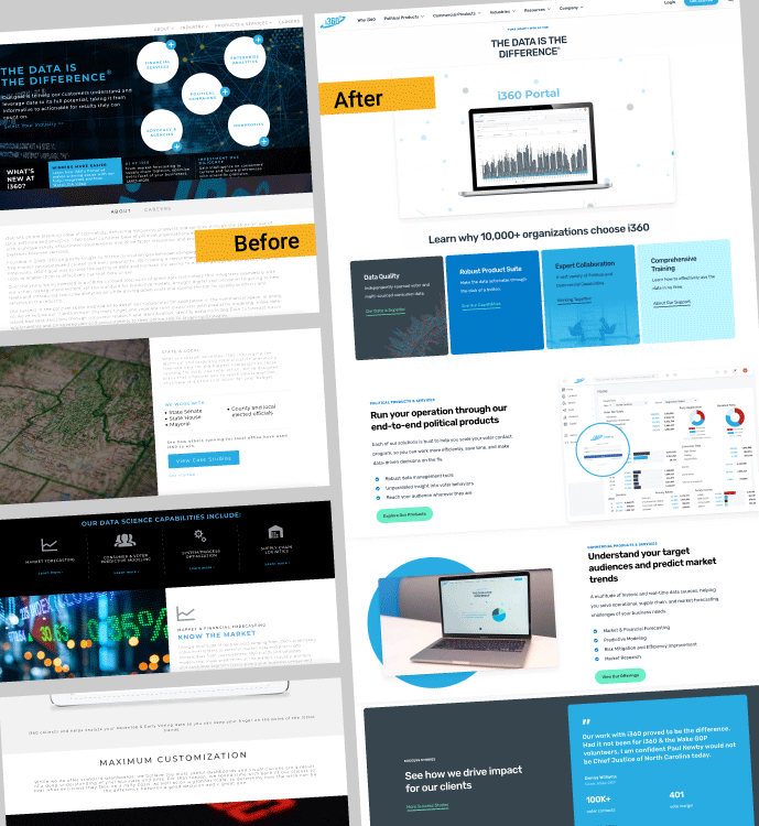 Challenge: i360 needed a modern, user-friendly website that better reflected its evolving product suite, clearly communicated its services, and improved visitor engagement. The previous site had a dark, dated design with hard-to-read fonts and poor content organization, making it difficult for users to navigate and understand the offerings.